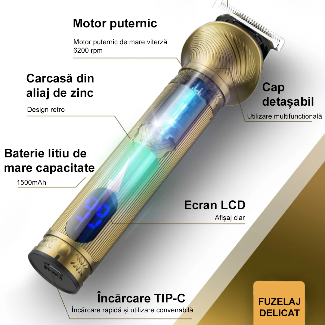 Bateria litiu-ion de 1500mAh ofera o autonomie extinsa, permitandu-va sesiuni multiple de tuns fara a fi nevoie de reincarcare frecventa. Incarcarea se face rapid si convenabil prin portul modern Type-C, compatibil cu majoritatea incarcatoarelor de telefon. Display-ul LCD afiseaza nivelul ramas al bateriei.